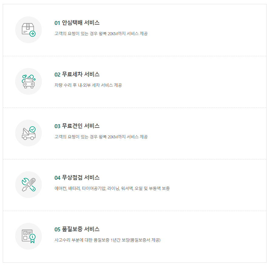 2.무료세차 서비스: 차량 수리 후 내외부 세차서비스가 제공됩니다.